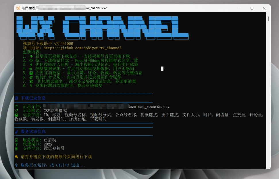 启动程序: 解压后双击 wx_channel.exe 启动。