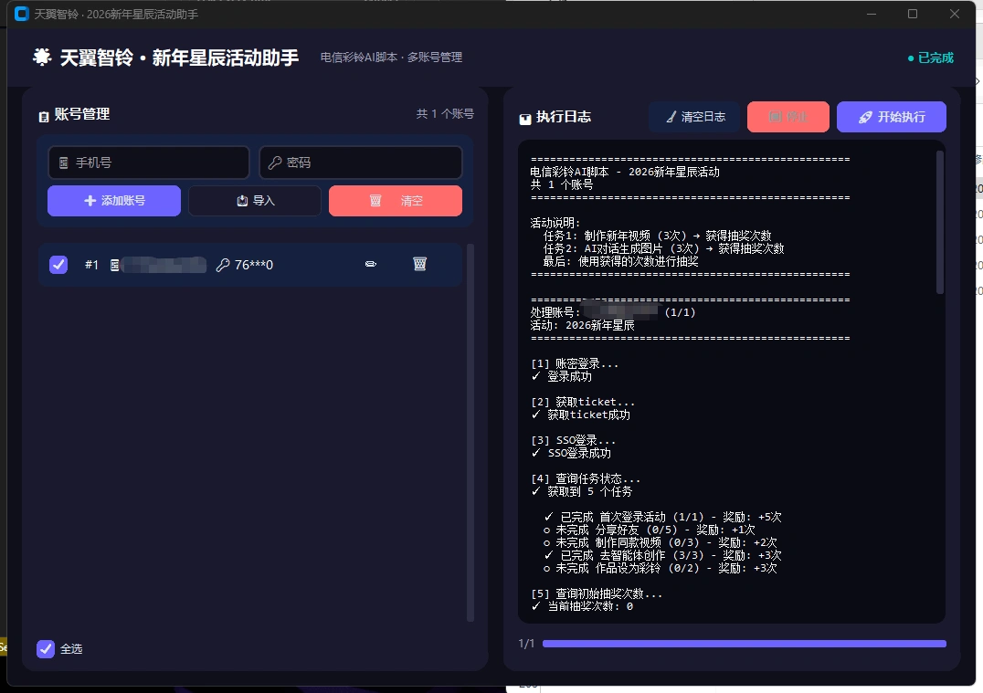 • 在软件里面输入手机号和密码,点开始运行即可开启全自动挂机
