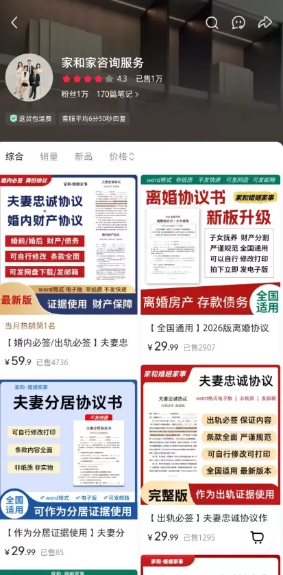- 最近刷到一个小红书店铺,卖的东西挺有意思:夫妻忠诚协议、离婚协议模板这类虚拟资料。