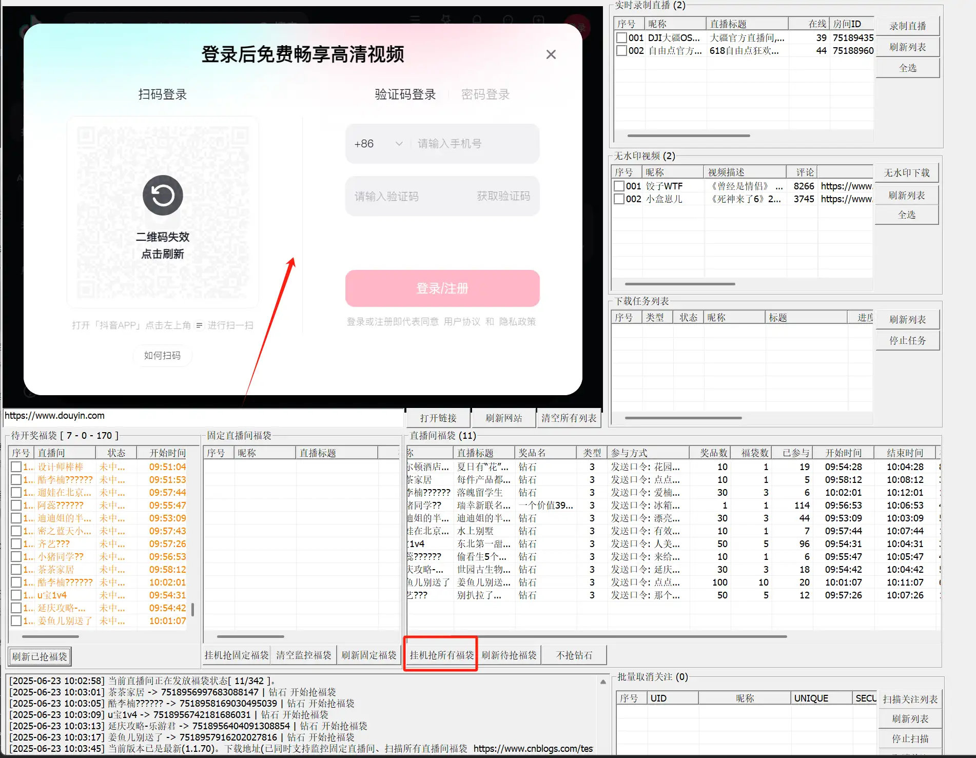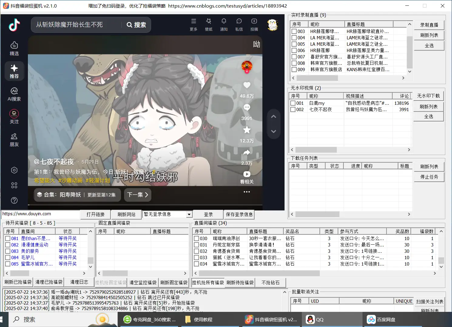• 2.直播间抢福袋功能,目前支持扫描平台所有直播间,并过滤出正在发放福袋的直播间进行参与。